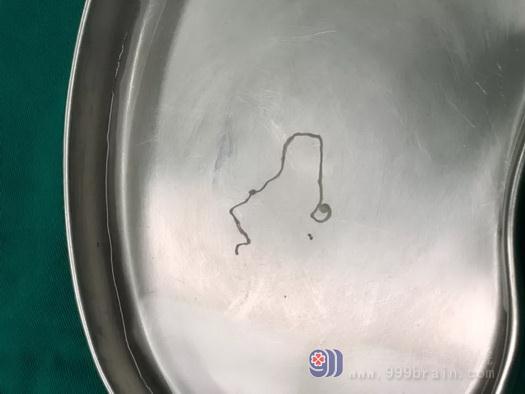 完善相关检查后,准备择期手术。因其上呼吸道感染,手术推迟到5月21日。当天上午,鲁明为患者在全麻唤醒麻醉下行右侧额顶叶寄生虫取出术及肉芽组织切除术。通过术中导航定位病变部位,在神经电生理监测下,一条长约7.5厘米的白色裂头蚴活虫很快进入医生视野,并被熟练地“擒拿”。术中,患者被唤醒,在其清醒的状态下切除病灶,使其语言、肢体功能均未受损。