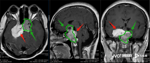 术前影像:绿色箭头考虑为垂体瘤,红色箭头考虑为脑膜瘤。