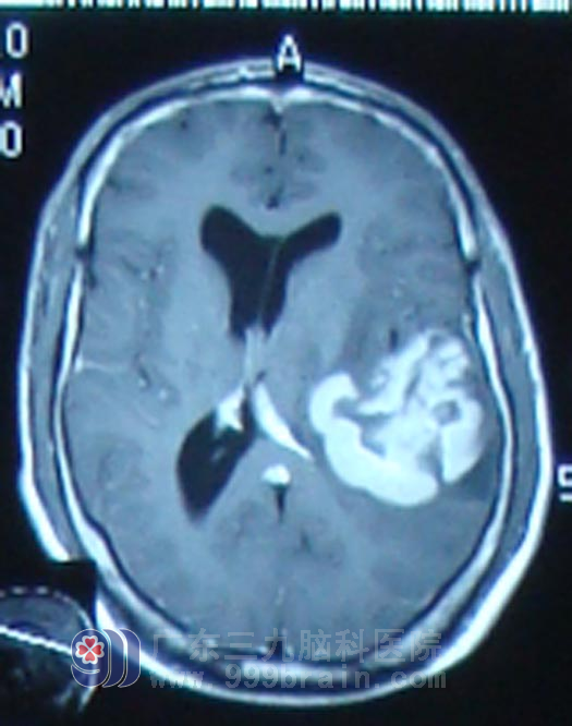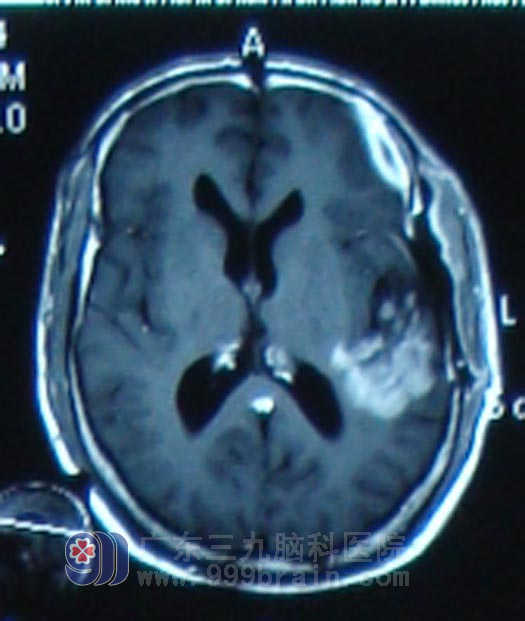 患者朱先生, 35岁,2011年10月21日无诱因出现头痛不适,且程度剧烈,伴言语不清,但是未予重视4天之后头痛正传未见缓解,还出现了呕吐数次,出现“癫痫”症状,表现为四肢抽搐,头后仰,双眼紧闭,持续2-3秒之后自行缓解,当地医院头颅CT及MR显示左颞叶占位,10月28日即来广东三九脑科医院就诊,来院时,朱先生神志清楚,不完全性失语,右侧肢体肌力稍减弱。完善相关检查且排除手术禁忌症后,11月4日行手术治疗,手术部分切除,术后病理为弥漫性大B细胞淋巴瘤,术后症状好转后转入肿瘤综合治疗中心行大剂量甲氨蝶呤化疗,化疗一程后复查MR显示原强化范围及水肿范围较前明显缩小。朱先生恢复到以往的工作和生活,医嘱定期复查。