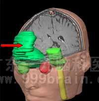 肿瘤空间位置示意图(箭头位置) 肿瘤三维重建示意图(箭头位置)
