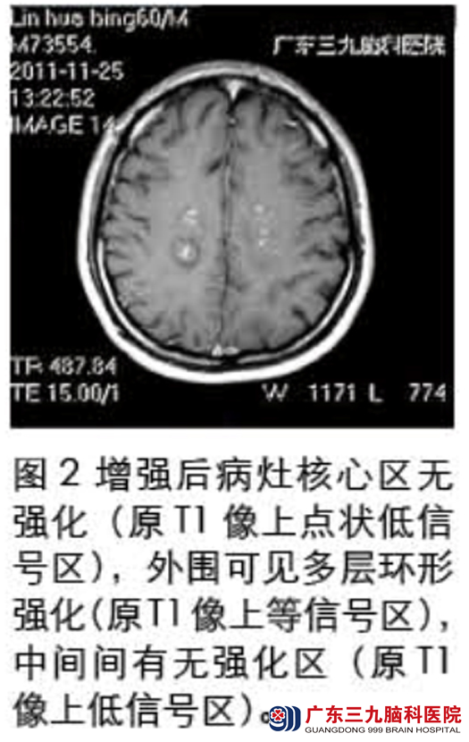 60岁的林先生因“头晕、行走无力1年于2011年11月到广东三九脑科医院求治。入院行头颅检查发现见林先生病变部位非常特殊,犹如一个同心圆状。据广东三九脑科医院 神经内二科主任称,林先生所患为Balo同心圆硬化,是一种较罕见的疾病。www.999brain.com