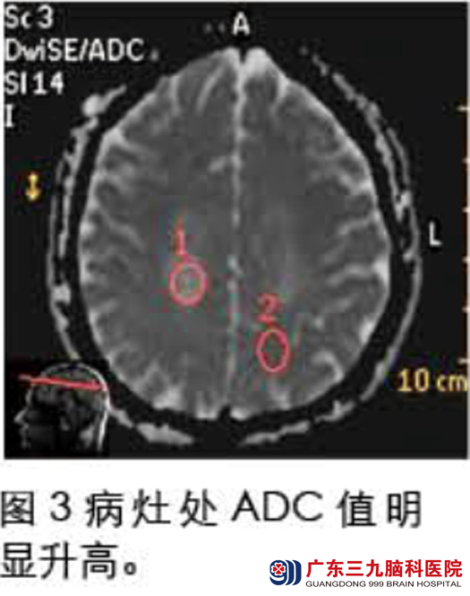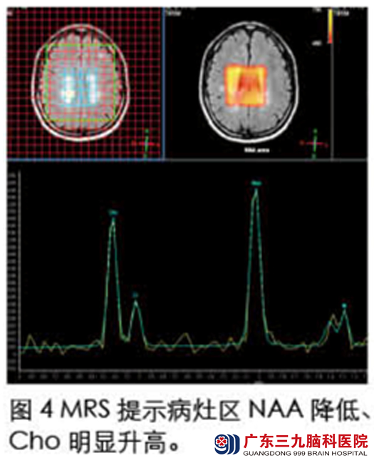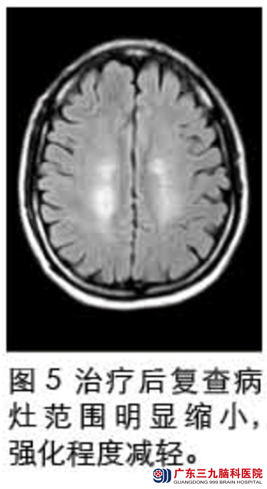 入院查体见双下肢肌力减退,肌张力偏高,腱反射亢进。头部磁共振检查示:双侧半卵圆中心多个长T1长T2病灶(见图1),伴强化(见图2),DWI序列ADC值升高(图3),MRS提示Cho峰稍有升高,NAA峰有所下降,Cr峰未见明显变化,可见Lip/Lac峰(见图4);腰穿结果:脑脊液常规正常,生化提示蛋白升高,寡克隆带阳性。确诊为Balo同心圆硬化,给予激素冲击、营养神经治疗。治疗后复查头部磁共振提示:颅内多发病灶范围较前明显缩小,异常强化程度较前减轻(见图5)。入院治疗一个月后林先生好转出院。www.999brain.com