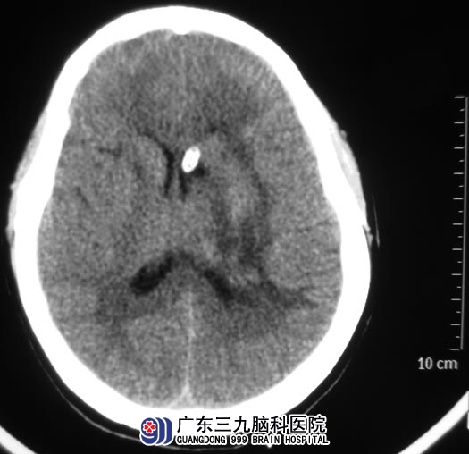 广东三九脑科医院头颅CTA检查提示:左侧基底节区脑出血破入脑室,未见动脉瘤或动静脉畸形。综合神经外科 鲁明主任建议立即手术治疗,全麻下行左侧基底节区脑出血钻孔引流+侧脑室穿刺外引流术;术后复查CT显示脑内血肿明显减少,血肿内给予尿激酶鞘内注射溶血凝块。