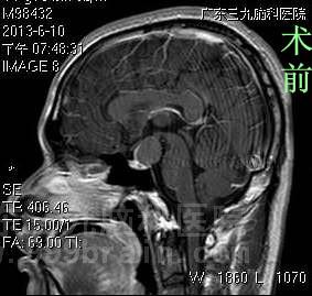原来,阿兵一个月前无明显诱因开始出现头痛,伴有视力下降,一周前症状较前加重,当地医院就诊,行头颅CT检查提示三脑室占位。经我院头颅MR检查提示鞍上区垂体后上缘示一类椭圆形占位病变,大小约27.2*20.6*19.5mm,垂体柄受压稍前移,垂体受压,矢状位示邻近视交叉受压前移。原来失准的三分球的罪魁祸首是脑瘤。