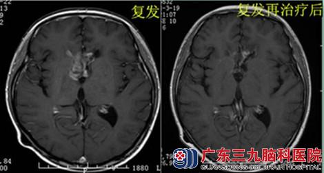 2013年初复查肿瘤增大,考虑复发,化疗两程后开始行生物免疫治疗(CIK),目前已治疗5程,患者情况良好,头颅MR示原病变强化范围逐步缩小,建议定期复查。