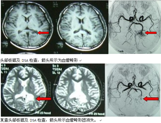 陈女士,23岁,突发头痛起病。查头部核磁显示,左侧脑室三角区异常信号,查DSA显示,以左侧大脑中动脉供血为主的血管畸形。行X刀治疗,一年后复查DSA,血管畸形团消失。
