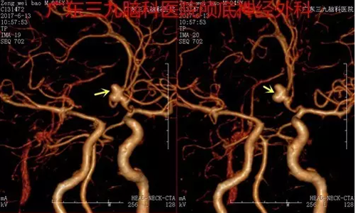 图2术前CTA提示前交通动脉示一较大不规则囊状突起,范围约9.7mm×9.3mm,瘤颈宽3mm