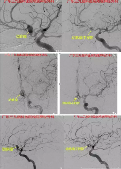 图3、4、5:术前术后DSA对比,箭头所示动脉瘤,术后动脉瘤夹形态稳定,动脉通畅