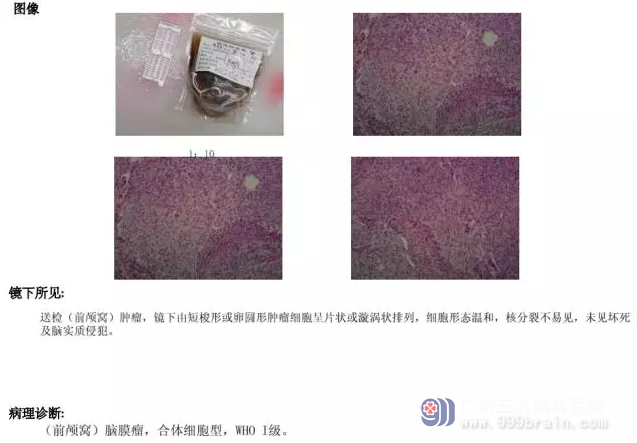 图5:术后病理提示(前颅窝)脑膜瘤瘤,WHOⅠ级