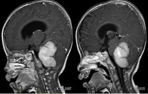 手术是髓母细胞瘤最主要的治疗手段,手术的主要目标是解除导水管梗阻 , 恢复脑脊液通路;最大限度切除肿瘤(最小程度影响脑干的解剖生理功能)。术后对残余肿瘤或者瘤腔给以放、化疗,其疗效十分确切,因此,放化疗也是髓母细胞瘤的重要治疗手段。