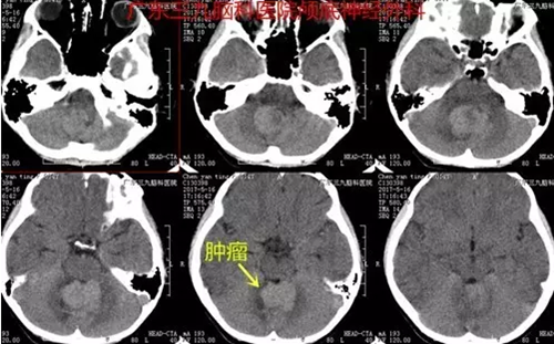 图1:术前CT提示四脑室-小脑蚓部一团块状稍高密度占位性病变