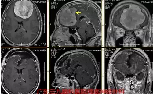林先生今年54岁,3年前无明显诱因出现头痛,一般疼痛不厉害,厉害时或吃一两粒去痛片即好转。1年前,出现双眼视力下降。为明确疾病至广东三九脑科医院治疗。入院后,磁共振检查初步诊断为大脑镰窦旁脑膜瘤,肿瘤直径达7.5cm。