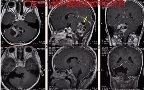 图3:术前MR轴位增强片,增强后病变实性部分和囊壁呈明显异常强化影,范围约为6.0cm×5.1cm×5.6cm,其内示少许流空血管影,周围未见明显水肿影。脑干受,四脑室受压消失。增强后全脑沟内示广泛线状异常强化影。双侧小脑幕增厚、强化。