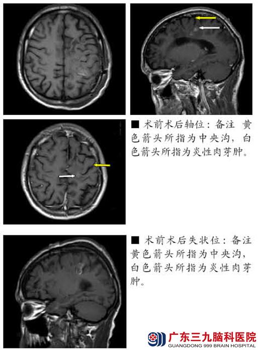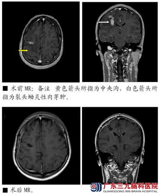患者于2011年3月份无明显诱因出现意识不清,头部向左侧偏转,双眼向上凝视,四肢僵硬伴抖动。持续数分钟后自行缓解,4小时后患者再次出现一次上述症状。至当地医院行头部核磁共振示右额中央区占位病变,考虑炎性肉芽肿可能,予卡马西平 0.2g tid治疗。患者仍有癫痫发作,表现形式:2011-2012上半年主要表现为面肌抽搐;2012下半年为左侧肢体抽搐;持续时间约1分钟,有时仅出现肢体、面部麻木感,发作过程中患者意识清楚。每年发作约10次。既往食用过未煮熟青蛙史。查体:生命体征平稳,神清,颅神经检查未见明显异常。脑膜刺激征阴性,四肢肌力正常,肌张力无明显改变。感觉系统检查未见异常。生理反射存在,病理征未引出。入院后头颅MR提示右额中央区异常强化灶,病灶形态与位置较前变化,范围较前略大,周围水肿大致同前,考虑裂头蚴脑病可能性大。诊断:1.症状性癫痫(复杂部分性发作,部分性发作继发全面性发作)2.右额中央区病变(脑裂头蚴病可能性大)。于2013-07-25在术中唤醒及导航下行右侧额中央区病变切除术,手术顺利,术中取出活虫一条,长约6cm。术后患者无再出现癫痫发作,四肢肌力同术前,肌张力无明显改变。感觉系统检查未见异常。