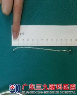 小徐在当地医院做了检查,结果提示“右额顶中央区占位病变,右顶枕软化灶”,家人带着小徐到广东三九脑科医院进一步治疗。微侵袭神经外科的吴杰主任为小徐查体后,发现其有食青蛙、蛇等饮食习惯,寄生虫抗体检查呈阳性。完善了所有检查后,吴主任为小徐进行了右额顶中央区占位性病变切除术,术中从其颅内取出一条300px左右的裂头蚴。