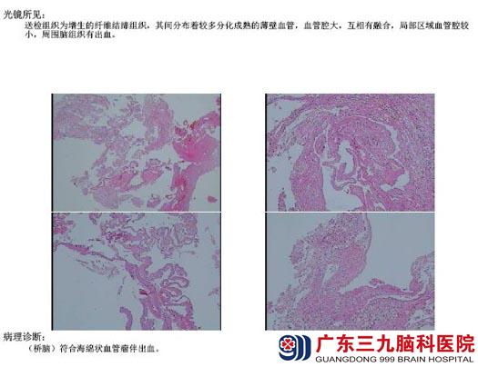 由鲁明主任主刀,在全麻电生理监测下行桥脑海绵状血管瘤+血肿清除术,术中导航再次定位,电生理监测确定桥脑无核团区后,显微镜下见液态黑色陈旧性血块及黄褐色含铁血黄素,予吸除,内可见葡萄样血管病变,予激光刀切除,术中电生理监测全程未见明显神经异常放电。术后小玉逐渐好转,十天后即能自行行走,已康复出院。术后病理结果:海绵状血管瘤伴出血。