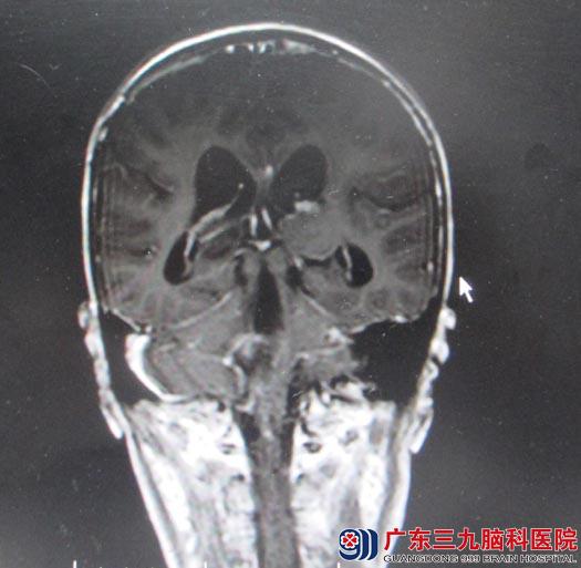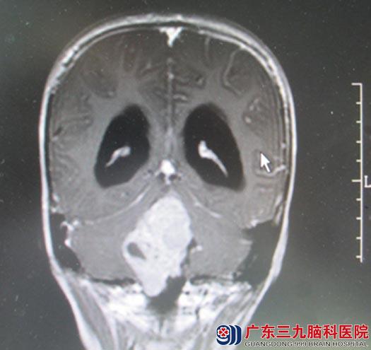 入住广东三九脑科医院时精神状态差,频繁呕吐,站立和行走时姿势和步态摇摆,走“一字步”欠稳。头颅MRI提示“四脑室巨大占位,梗阻性脑积水”。