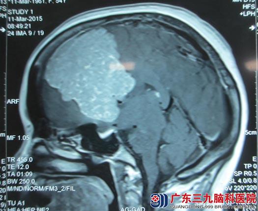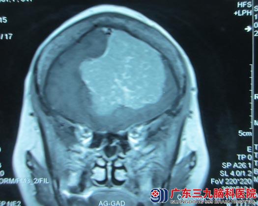 2015-04-02由鲁明主任主刀在全麻下行“左侧额部镰窦旁巨大脑膜瘤切除术”,术中见肿瘤主要位于左额部,与上矢状窦关系密切,侵犯大脑镰并推挤粘连下矢状窦,双侧大脑前动脉被肿瘤推压向右侧移位,显微镜下小心分离完好保护上矢状窦,分块切除肿瘤,部分大脑镰被肿瘤侵犯破坏,予电凝后切除,最终肿瘤镜下全切,手术顺利,术中出血600ml,输血400ml。患者术后恢复良好,无明显肢体运动及感觉障碍。