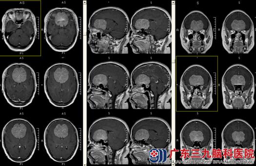 今年57岁的程阿姨,因“头痛伴视物模糊、多尿半年,加重1周”来医院就诊。入院后查体:神志清楚,精神差,言语缓慢,思维迟缓,记忆力下降。查体可配合。辅助检查:前颅窝底大脑镰两旁巨大占位性病变,考虑脑膜瘤可能性大;MRV检查提示:上矢状窦额部显影浅淡,额部静脉分支增多。CTA:前颅窝底巨大软组织肿块,供血极其丰富,邻近双侧大脑前动脉及分支明显受压向上移位,其中A1-A2段部分主干及额极动脉被包绕。入院诊断:前颅窝底巨大脑膜瘤。