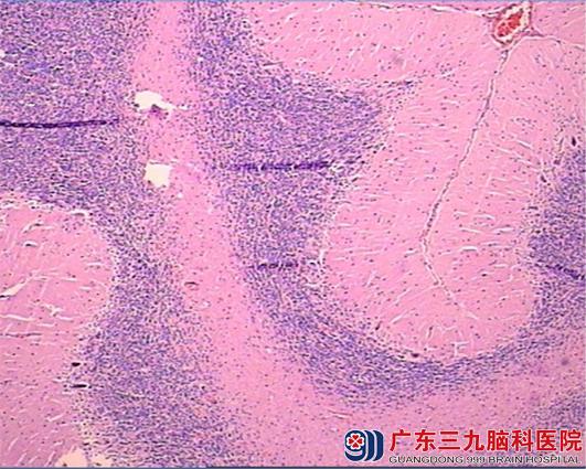 图7 光镜 (HE染色X400)病理图片可见小脑皮质的三层结构:分子层、蒲肯野氏细胞层、颗粒层;中间粉染区为不典型的小脑髓质