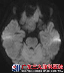 图5 弥散加权:病变呈等信号,其前方囊性部分呈低信号