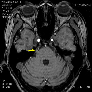 1年前,患者自觉右侧下牙龈闪电样疼痛,在当地医院就诊,医生考虑可能是龋齿,为其拔除数颗牙齿后,患者的疼痛仍无缓解,并有加重的趋势。有时疼痛在右侧面颊部,有时在耳后部,疼痛非常剧烈,难以忍受。之后在某医院诊断为三叉神经痛,医生予以改善循环,营养神经、止痛等治疗,患者的疼痛有所减轻,出院后继续药物维持治疗。