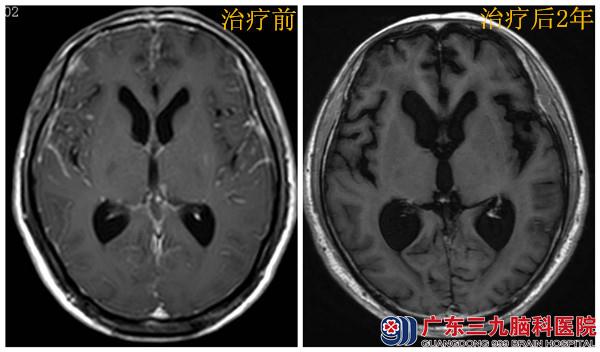 2013年6月患者再次到我院就诊,腰穿测得颅内压力大于330mmH2O。入院后逐渐出现意识模糊、言语含混、小便失禁,腰穿测得颅内压力大于500mmH2O。脑脊液细胞学检查回示:可疑癌细胞,头颅CT示:脑积水表现。结合辅助检查考虑有脑膜癌可能,亦不排除转移瘤可能,行胸部CT提示左肺舌叶下段病变,考虑周围型肺癌。患者因严重脑高压暂不宜行颅脑放疗,予替莫唑胺+吉非替尼行急化疗和分子靶向治疗,并予脱水降颅压等对症支持治疗,病情稳定后予行全脑放疗,40Gy/20f。治疗后,患者头痛头昏症状明显好转,未再出现恶心呕吐等症状,后续替莫唑胺+吉非替尼维持治疗。目前已治疗后近两年,患者KPS100分,神志清楚,精神好,能从事轻体力劳动。