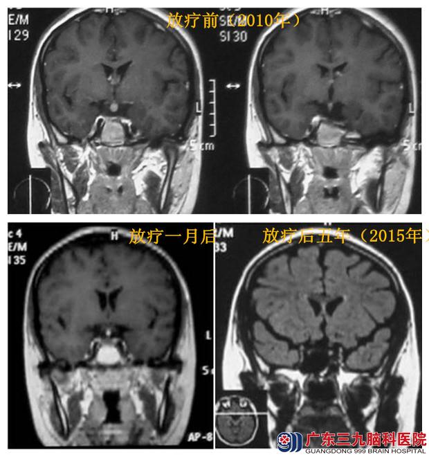入院完善相关检查,肿瘤标记物HCG轻度增高,考虑生殖细胞瘤可能。因病灶部位位于垂体柄,手术可能导致内分泌紊乱及激素水平低下,患者及家属拒绝手术,选择行放疗治疗,诊断性适形放疗20Gy/10f后复查头颅MR,示垂体占位病变范围较前缩小,诊断:生殖细胞瘤。行全脑全中枢放疗3000cgy/15f,结束后复查头颅MR示病变已消失,随后行6程辅助化疗。患者随访至今已5年,未见肿瘤复发,未出现明显不良副反应,可正常工作与生活。