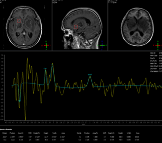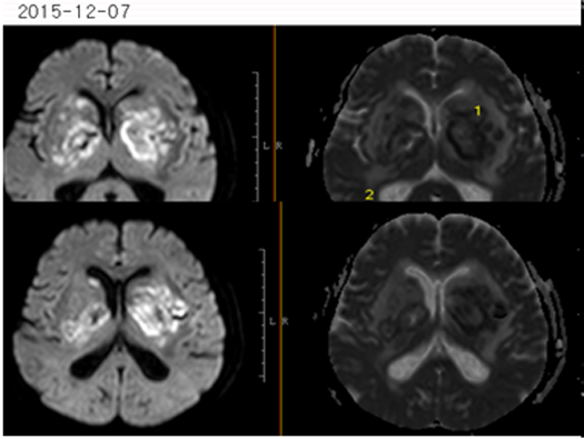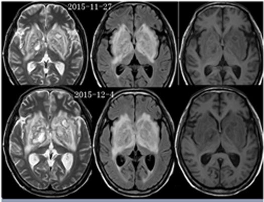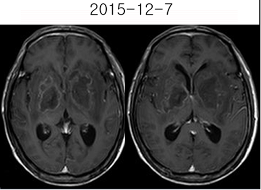 2015-11-27MR:双侧基底节区及双侧大脑脚示较对称片状异常信号, T1WI呈不匀低信号影,T2WI呈不匀高信号影,FLAIR序列呈不匀高信号,累及视交叉、视束及部分丘脑。2015-12-04复查:双侧基底节区及双侧大脑脚病灶范围较前稍增大。2015-12-07增强后病变呈多发环形薄壁或片状强化,DWI呈不均匀高信号。右侧基底节区病灶感兴趣区,可见Cho峰、NAA峰及Cr峰,Cho峰未见明显升高,Cho/Cr比值约为0.34,NAA/Cr比值约为0.56,Cho/NAA比值约0.61。综合平扫、增强、DWI、MRS所见,可排除肿瘤性病变,支持感染性病变(真菌或病毒感染可能性大)。