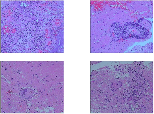 光镜所见:送检(右侧基底节区)少许脑组织,小胶质细胞和肥胖型星形细胞增生、灶片状出血,神经元尼氏小体边集或消失,核固缩,突起减少或消失,核小体仁不明显,小胶质细胞侵入,形成神经元卫星现象或噬神经元现象:血管周围较多淋巴细胞、浆细胞及中性粒细胞浸润,局部可见坏死组织及多核巨细胞,其间散在少量真菌菌丝及孢子。