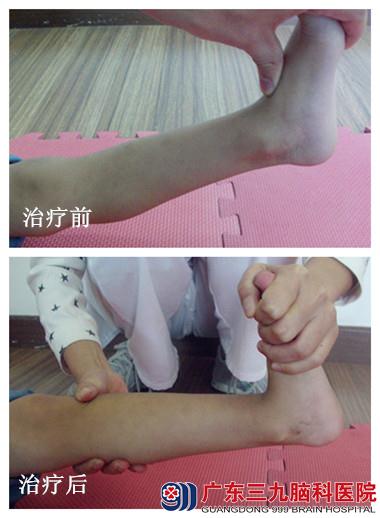 患儿聪聪,男,1岁11月,低体重出生儿,主症运动发育迟缓,可独立行走,易摔倒,双膝轻度反张,双踝背伸阻力稍大。2014年8月11日,入住广东三九脑科医院脑瘫诊疗中心,先进行康复治疗,再进行A型肉毒素100U注射右侧腓骨长肌肌腹,且订制矫形支具帮助患儿改善畸形。2015年8月17日患儿返院,予双侧小腿三头肌肌腹肉毒素注射治疗,再进行运动治疗、关节松动训练、针灸、电疗等康复治疗。出院后,患儿聪聪对外界反应灵敏,双膝反张较前改善,双足背伸阻力较前明显降低,肌张力约1级,稳定性较前改善。