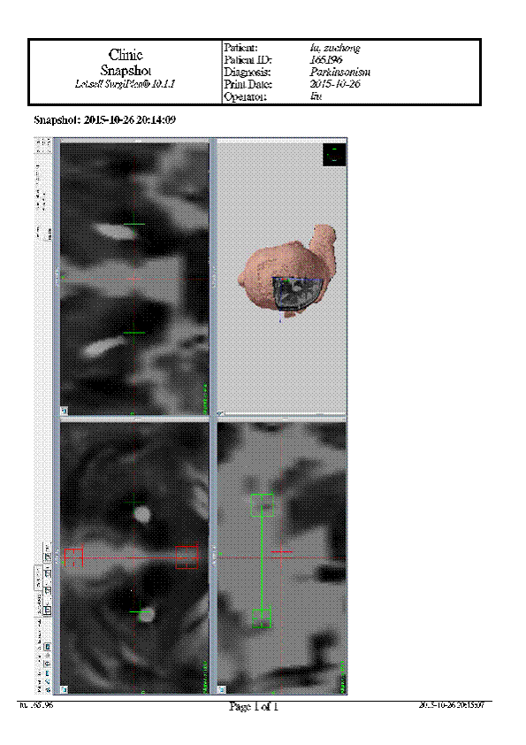 去年底,卢先生接受了脑深部电刺激术(DBS),靶点选择双侧丘脑底核(STN)。手术前,先通过导航系统,精准的测算出患者的靶点部位。术中,医生通过立体定向导航系统+Leadpoint记录仪联合精准的定位到患者的靶点。局麻下唤醒患者并与之交谈,用电刺激器调整参数,通过电流刺激症状,密切注意着患者的应答,肢体动作改变和术中电生理检测仪。调整刺激器的参数。患者可感受肢体的变化,震颤和僵直的改变特别明显,患者感觉满意。然后在全麻的情况下,把导线和刺激系统埋入皮下隧道,手术过程顺利完成。