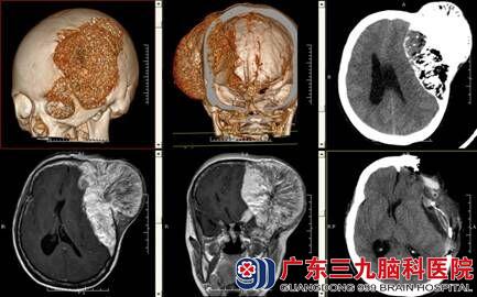 严女士,52岁,因外伤后头皮及左眼肿物10余年,头痛伴左眼失明2个月入院。