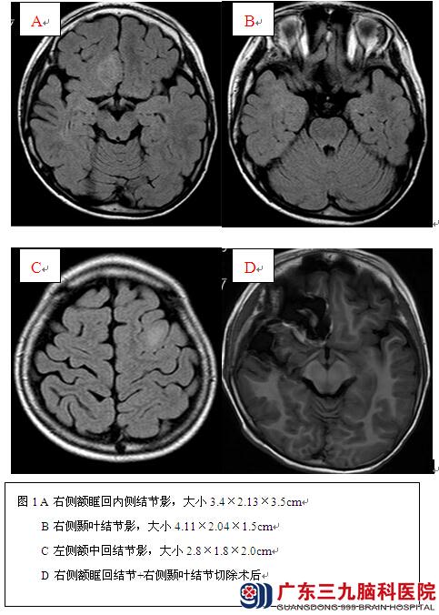 患者家属拒绝行颅内电极确定致痫结节,在我院行右额及右颞病灶切除后,术后未再出现发作。
