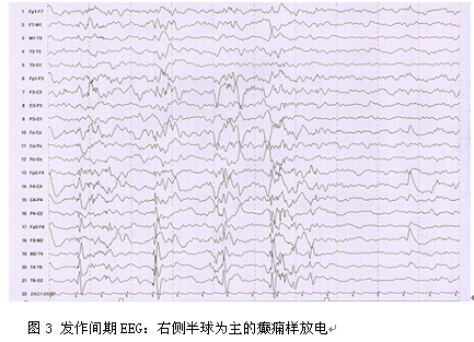 患者,男性,7岁10月,右利手。生后7个月开始首次发作,表现为:头眼左偏、左侧上肢发硬,10-60秒钟缓解,3-4次/天或1次/数天。2岁开始患者在上述发作出现自动运动(双手抓物或摸索动作),2-3次/天。起病后服用多种抗癫痫药物无效,现服四联抗癫痫药物治疗。第一胎足月顺产,1岁多会走路、说话,只能讲简短句子。患者智力低下,现读特殊学校,多动,注意力不集中,语言理解能力差,日常生活能力基本能自理。家族中无类似病史。查体:未见明显皮肤改变,神经系统未见阳性定位体征。