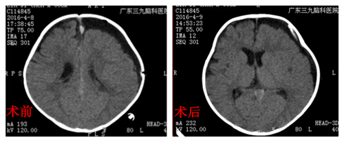 童童,男婴,八个月大,因蛛网膜囊肿入院。据童童的母亲朴女士介绍,在她怀孕33周的一次产检,B超检查发现胎儿颅内蛛网膜囊肿,当时在产科医生的建议下,先把宝宝生下来,定期复查,以密切观察囊肿的变化。童童出生后表现出头颅稍大,为进一步诊治来到广东三九脑科医院小儿神经外科,常规复查头部提示:左侧额颞顶枕部慢性硬膜下血肿,左侧颞部蛛网膜囊肿。入院后积极完善术前相关检查,无手术禁忌症情况下,2016年4月8日在全麻下行“硬膜下血肿钻孔引流术”,术中成功置入2.5#引流管一根,手术顺利。