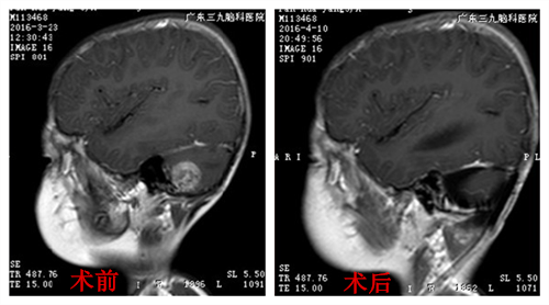 一个月前,晖晖又出现间断性头痛、恶心呕吐,家人意识到有可能是肿瘤复发,于是带着晖晖前往广州的广东三九脑科医院。晖晖头颅磁共振检查显示,右侧桥小脑角区及上段脊髓右旁、四脑室内多发病灶并强化灶,考虑:右侧桥小脑角区及上段脊髓右旁、四脑室内室管膜瘤。据小儿神经外科专家介绍,室管膜瘤属于中枢神经系统肿瘤,好发于儿童及青年,首选治疗方案为外科手术,不过该肿瘤术后复发率较高,多数为瘤床原位复发,对于肿瘤生长部位深、难以做到瘤体全切者,次全切除亦可获得良好的治疗效果。
