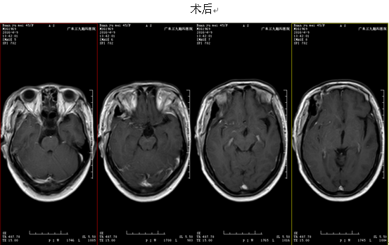 患者因6年前无明显诱因左侧视力下降,无头痛头晕,无恶心呕吐,无四肢抽搐,无发热,遂就诊当地医院,行头颅MR提示颅咽管瘤。予手术治疗(具体不详),术后患者左侧视力失明,术后病理提示:颅咽管瘤。术后患者未行放化疗等进一步治疗。患者于1个月前无明显诱因出现右眼视力下降,无头痛头晕,无恶心呕吐,无四肢抽搐,无发热,随就诊当地医院行头颅MR提示:鞍区占位性病变,颅咽管瘤复发可能性。现患者为求进一步治疗,来我院门诊就诊,门诊拟“颅咽管瘤术后复发”收治入院。患者发病以来,饮食可,睡眠可,大、小便正常。查体:左侧视力消失,右侧视力半米数指,余脑神经体查未见明显异常。辅助检查:我院头颅MR提示:头颅MR提示:鞍区占位性病变,颅咽管瘤复发可能性。入院诊断:颅咽管瘤术后复发;入院后于2016年4月5日行“颅咽管瘤切除术”,术中肿瘤完整切除,术后患者恢复较好,左侧视力同前,未诉头晕、头痛等其它不适。术后病理报告提示:“鞍区”颅咽管瘤(造釉细胞型)。