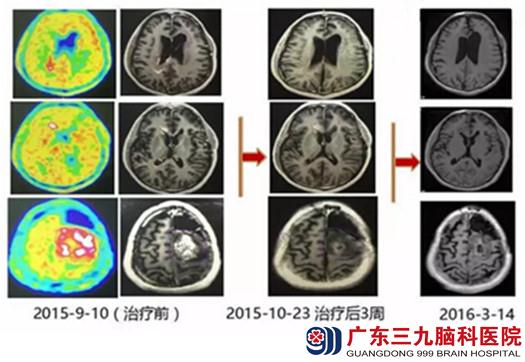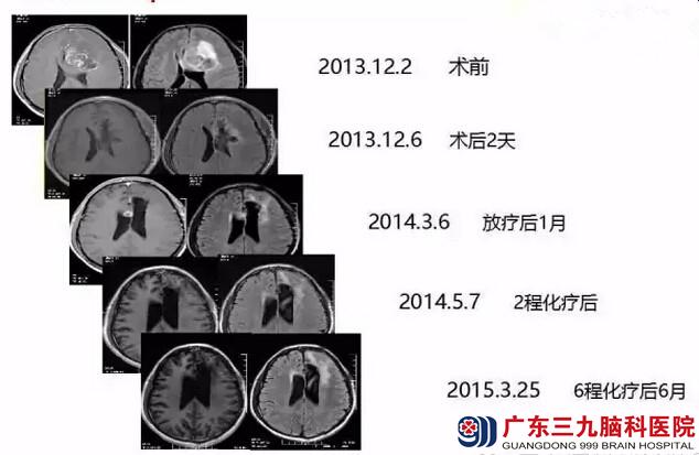 广东三九脑科医院肿瘤综合治疗中心蔡林波主任介绍,复发肿瘤的治疗,应根据复发部位、肿瘤大小、颅内压情况、患者全身状态以及既往治疗综合考虑。如患者一般状态良好、占位效应明显的局部复发肿瘤,推荐外科手术治疗。对于不适合再手术的患者,可推荐放射治疗和(或)化疗;如果以前接受过放疗不适合再放疗者,则推荐化疗。本案例中,复发胶质母细胞瘤再程放疗联合TMZ(替莫唑胺)、靶向药物治疗有效。