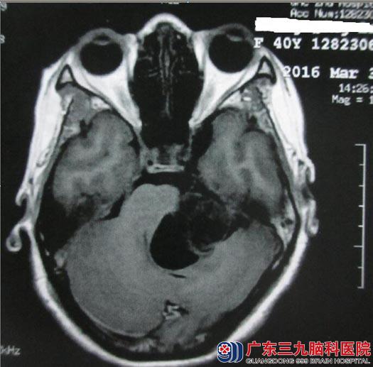 住院在广东三九脑科医院综合神经外科,查体:左侧鼻唇沟变浅,左侧轻度面瘫,左侧面部有麻木感,闭目难立征(+)。