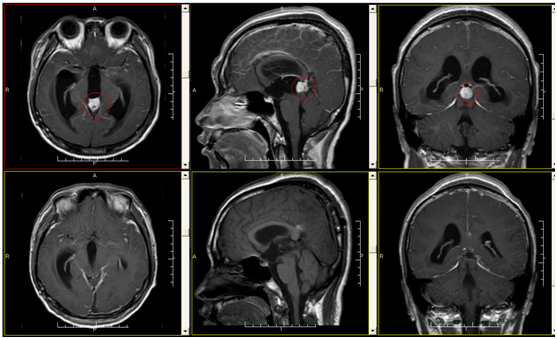 21岁,青葱的岁月,正是意气风发,朝气蓬勃的年龄,可在大学生小方身上,我们看到的更多的是人生的酸苦。2016年3月的一天,持续头痛和全身抽搐发作,突然闯进了这个小伙子的美好生活。发病后家人送小方到当地医院就诊,头颅MR提示:“1.松果体区占位性病变,拟为肿瘤性病变,生殖细胞瘤?松果体细胞瘤?2.梗阻性脑积水;3.可疑乙状窦及横窦血栓形成”。为求进一步治疗,来我院就诊。入院考虑“松果体区占位性病变,梗阻性脑积水,症状性癫痫”,完善术前准备后予行手术切除肿瘤,术后症状缓解,癫痫无发作。