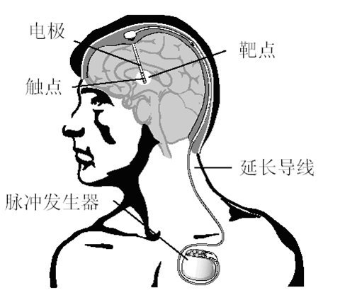 脑深部电刺激(DBS)是通过微创手术的方法在脑内放置一或两根电极,通过电极发射电脉冲刺激控制脑深部核团等特定区域,例如苍白球内侧部(GPi)和丘脑底核(STN)。