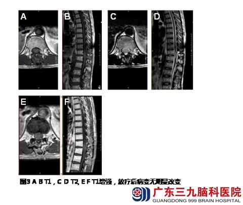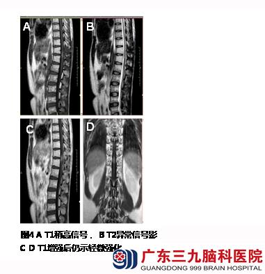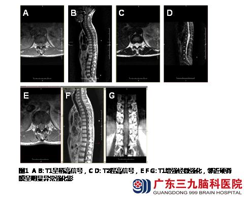 治疗经过:入院查胸椎平扫+增强示:脊髓胸11-12水平段呈局限性肿胀、髓内示卵圆形长T1长T2异常信号影,范围约15.6mm×29mm×17.4mm。增强后可疑部分轻微强化征像,邻近硬脊膜呈明显异常强化影(图1)。