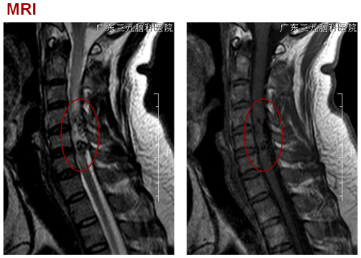 颈4-6水平脊髓内(偏右后部)病变及延髓至颈6水平脊髓周缘线状强化影,考虑为动静脉畸形,并颈髓水肿。