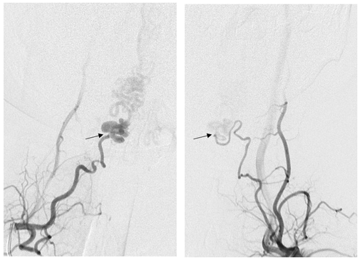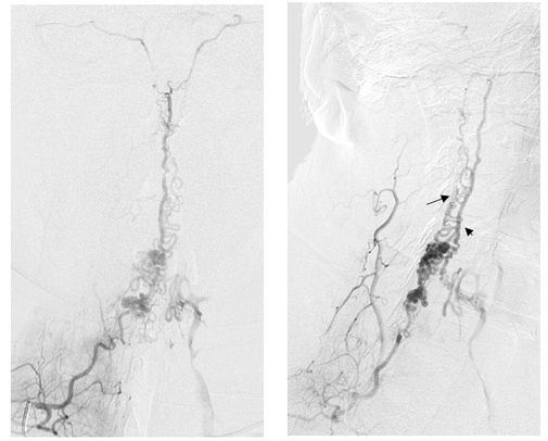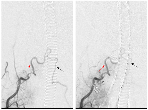 栓塞后复查右侧甲状颈干造影见引流静脉不显影,瘘口完全栓塞。右侧颈升动脉(红箭)经吻合处逆流进入左侧颈升动脉(黑箭)。证实双侧颈升动脉供应相同瘘口。