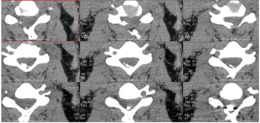 栓塞后CT显示颈4-6水平(偏右后部)栓塞材料高密度影。