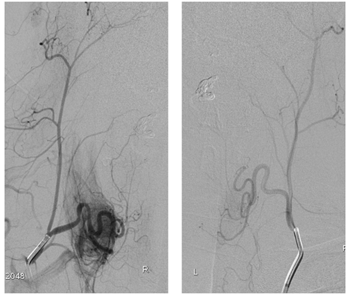 左侧甲状颈干选择性造影,显示瘘口位置及扩张静脉与对侧形态形态相似。考虑双侧颈升动脉供应相同瘘口。予以ONXY进行栓塞瘘口,栓塞物控制于扩张的静脉球内。