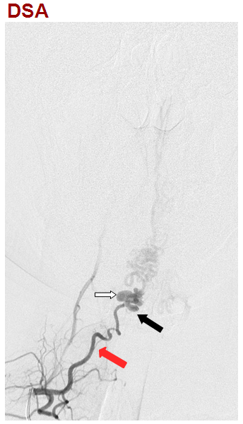 右斜位,右侧甲状颈干造影动脉期,显示颈升动脉(红箭)供应颈4-5水平瘘口(黑箭),静脉迅速出现,伴静脉球形成(白箭)。