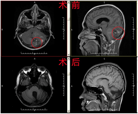 患者陈某,男,22岁,因“反复头痛10年余,复发加重2月”入院;查体:未发现明显阳性体征;辅助检查:我院MR检查回示:左侧小脑半球血管性疾病可能,伴小脑扁桃体下疝;入院诊断:1、左侧小脑半球及蚓部血管畸形并破裂出血? 2、小脑扁桃体下疝;予行“小脑蚓部及左侧小脑半球AVM切除术+血肿清除术”,术程顺利,术后患者恢复良好。