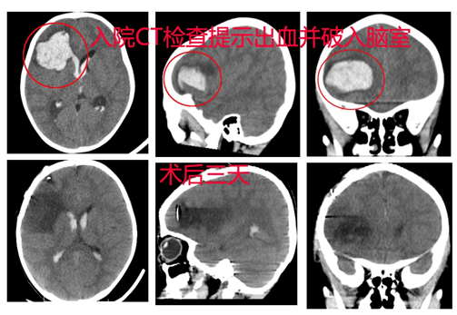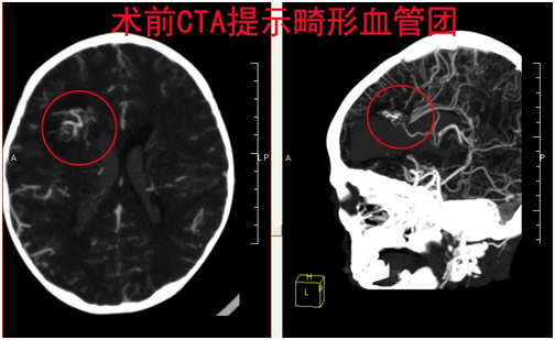 患者曹某,男,3岁,因“突发头痛、呕吐3小时”于2016-02-20入院;专科检查: 昏迷,不能睁眼,不能发音,刺痛躲避。双侧瞳孔等大等圆,直径2.0mm,对光反射灵敏;辅助检查:头颅CT提示:右额叶脑出血并破入脑室、脑积水、脑肿胀。入院后完善CTA检查,急诊手术治疗。术程顺利,术后患者恢复良好。
